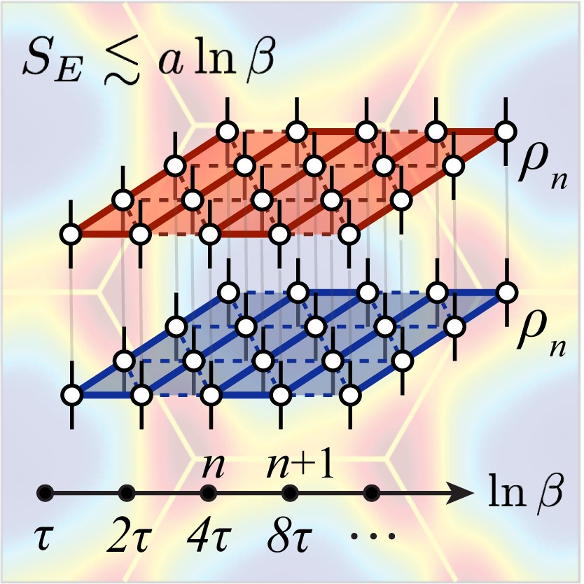 图1. XTRG方法:将系统的密度算符与自身相乘,从而获得更低温度(2倍倒温度)的密度算符,受到有限温度物态的纠缠的上界随倒温度对数发散的启发(左上公式),系统的热力学模拟沿着下方所示的对数温度轴均匀变化,即获得指数加速降温。XTRG可以用于计算阻挫晶格反铁磁体的热力学性质,背景所示为三角晶格反铁磁体的有限温度结构因子。