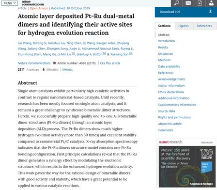 北京时间10月30号Nature Communications以“Atomic layer deposited Pt-Rudual-metal dimers and identifying their active sites for hydrogen evolutionreaction”为题在线发表了双原子催化领域取得的研究成果,文章通过实验和理论计算发现双金属二聚体可以表现出高的催化活性和稳定性。