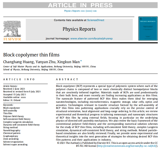 近日,yl9193永利集团满兴坤教授团队在物理学著名综述期刊《Physics Reports》(影响因子:25.6)上发表题为《Block Copolymer Thin Films》的综述文章。yl9193永利集团博士生黄昌杭和朱艳艳分别为第一和第二作者。北航满兴坤教授为唯一通讯作者,yl9193永利集团为通讯作者单位(文章链接:)。