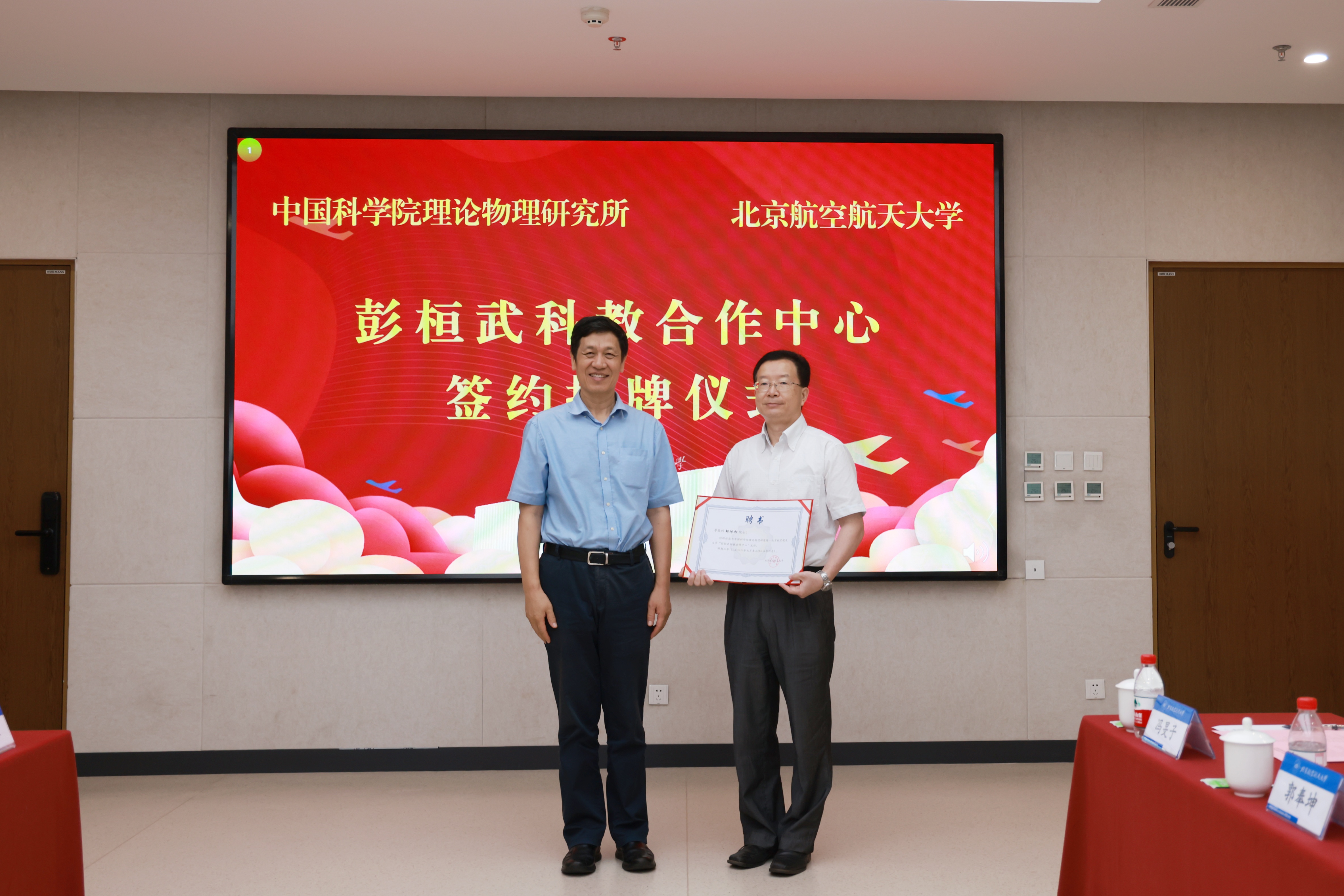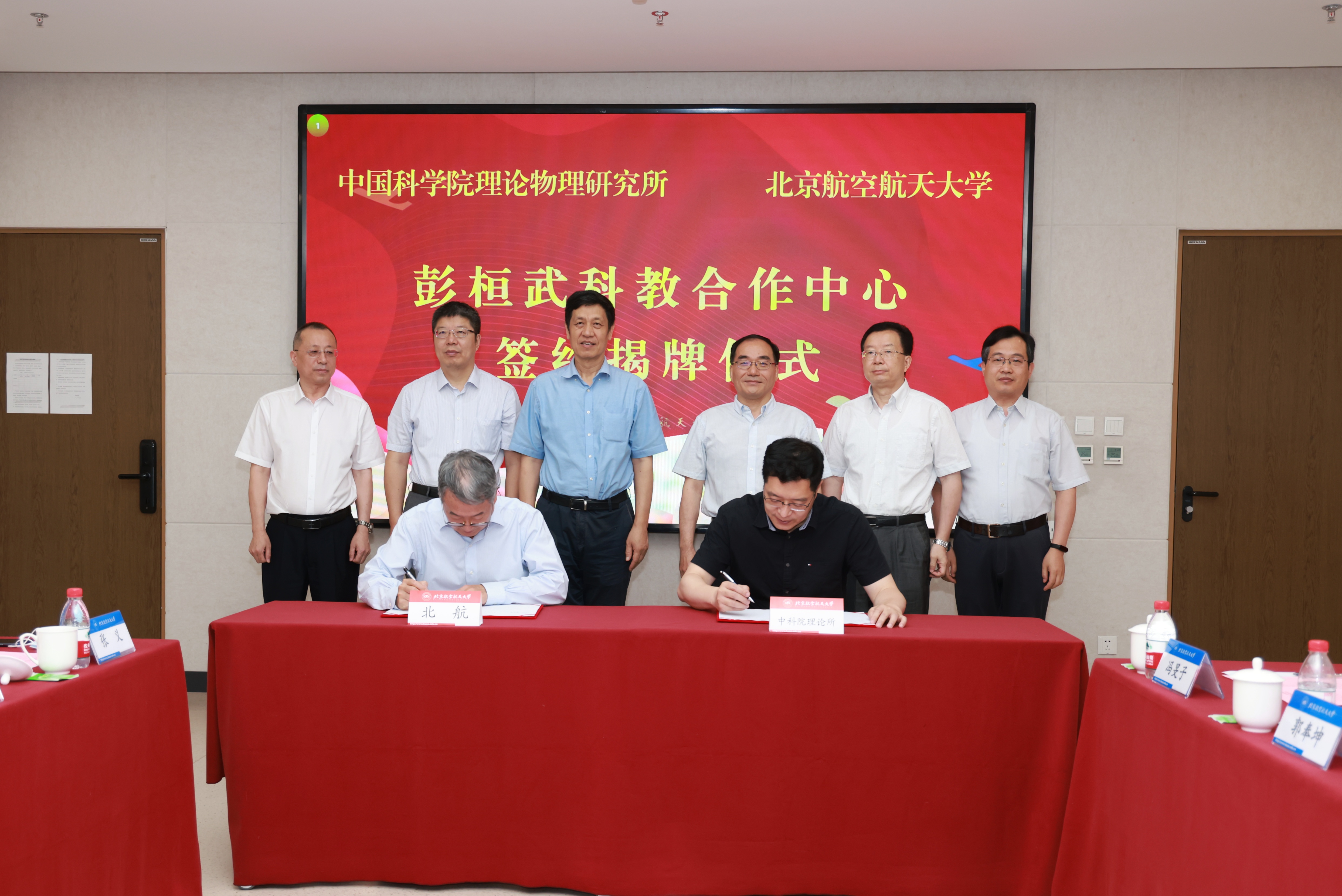 黄海军和王延颋分别代表北航和理论物理所签署战略合作协议。徐惠彬、黄海军、蔡荣根、邹冰松共同为彭桓武科教合作中心揭牌。