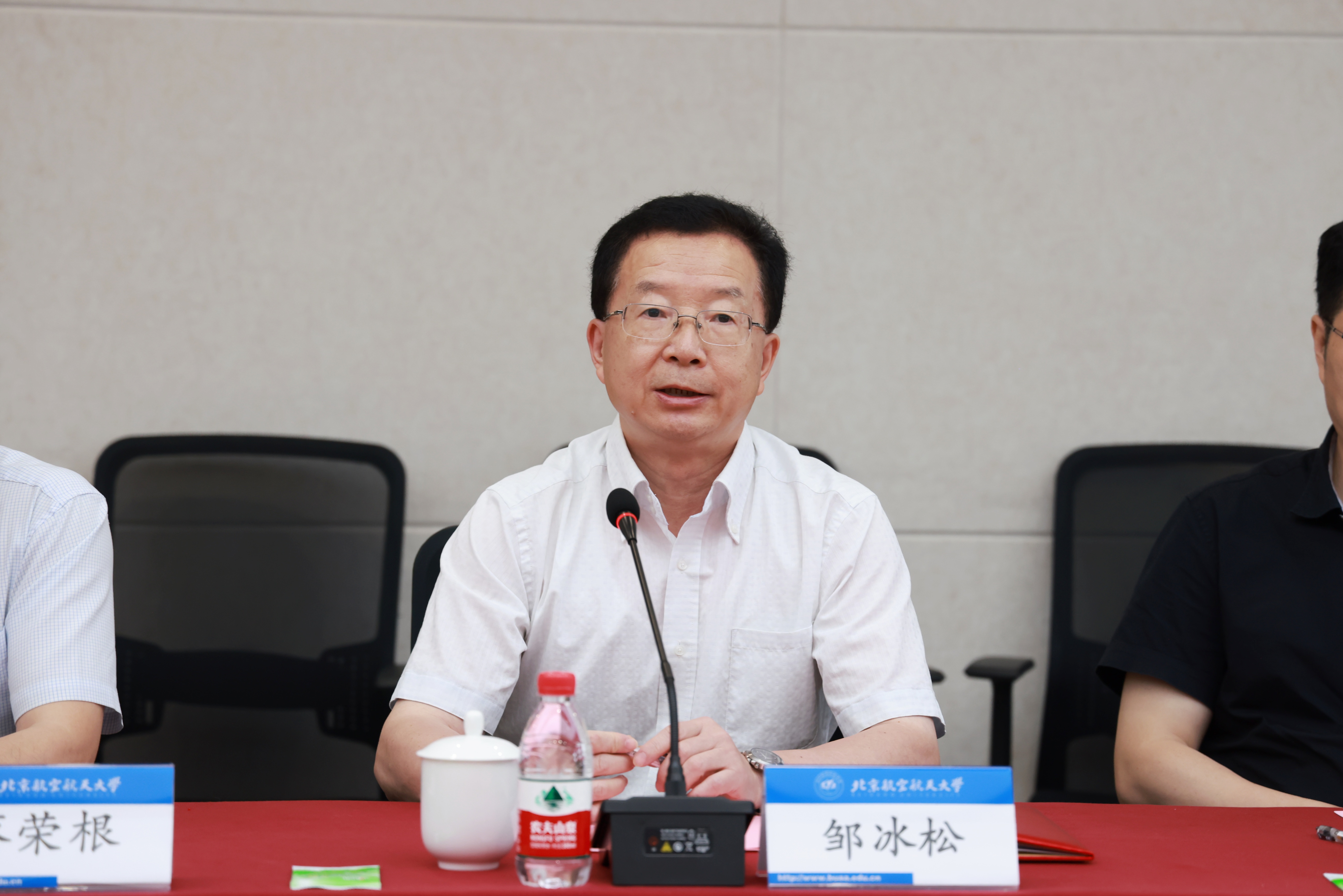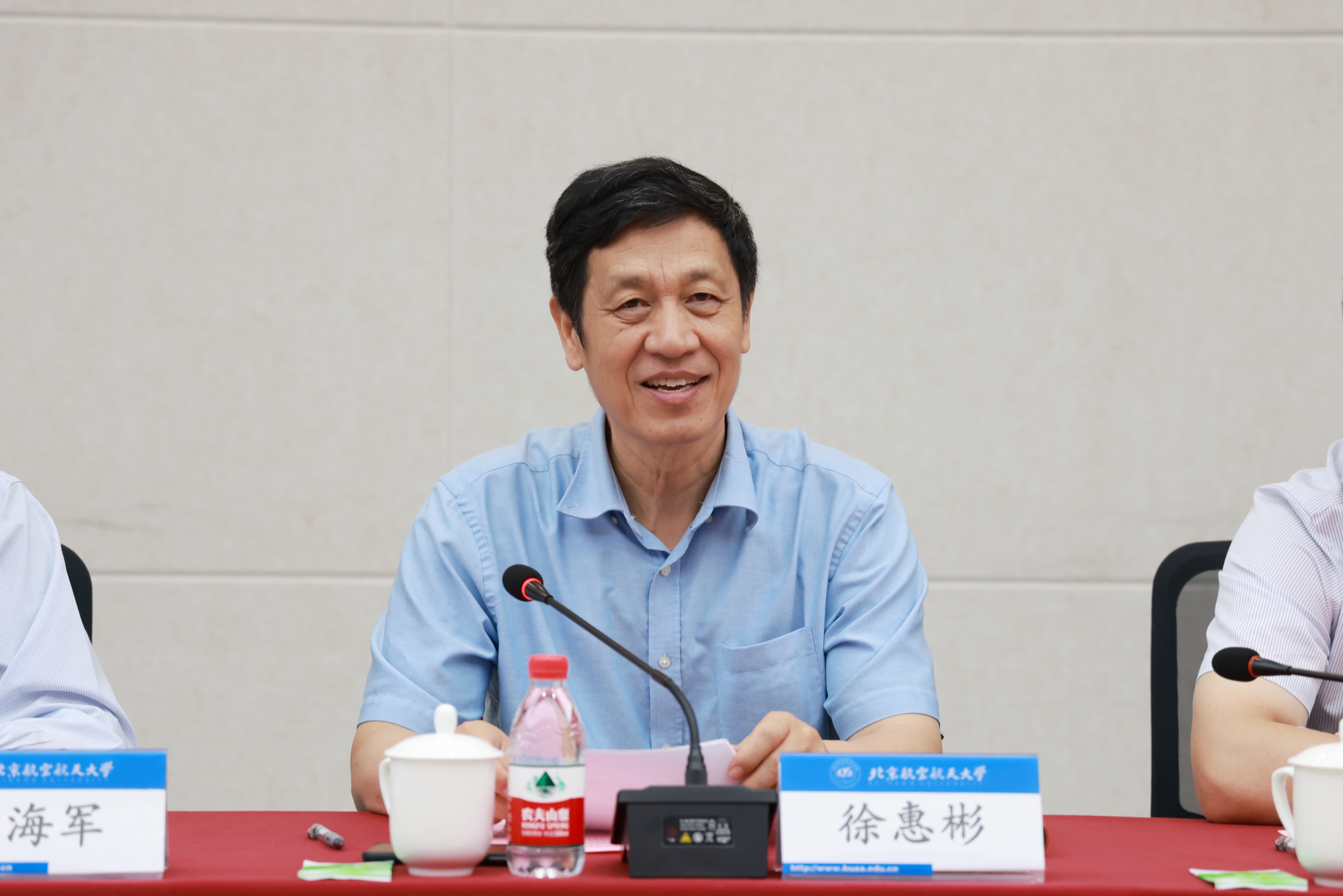 徐惠彬对蔡荣根院士、邹冰松院士一行的到访表示热烈欢迎。他指出,理论物理研究在自然科学研究中具有重要意义、在国家科技发展战略中占据重要地位。北航为国而生、与国同行,以服务国家为最高追求,始终围绕国家重大战略需求开展人才培养和科学研究。他表示,中心的成立旨在汇聚国内外高端人才,进一步提升青年教师及研究生的培养水平,全面提升服务国家重大战略需求和探索国际科学前沿的竞争力。希望以此次中心建立为契机,与理论所密切联系、深化合作、高效互动、优势互补,聚焦重大前沿科学问题,促进交叉学科发展,探索创新型人才的培养模式,为国家大科学工程提供有力支撑,为实现高水平科技自立自强做出新的更大的贡献!