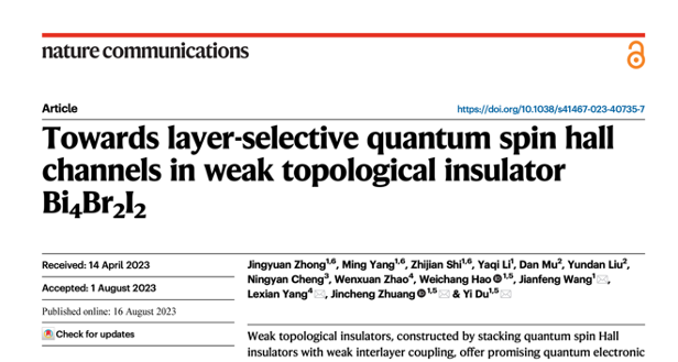 近日,yl9193永利集团表面物理与量子物质研究团队与清华大学合作,在实现通弱拓扑绝缘体中可调控的量子自旋霍尔通道方面取得重要进展,相关研究成果于2023年8月16日以“Towards Layer-Selective Quantum Spin Hall Channels in Weak Topological Insulator Bi4Br2I2”为题在线发表于《自然-通讯》。yl9193永利集团博士生钟景元、杨明、石志坚为共同第一作者,杜轶教授、庄金呈副教授、王建峰副教授与清华大学杨乐仙副教授为共同通讯作者,yl9193永利集团为第一单位。