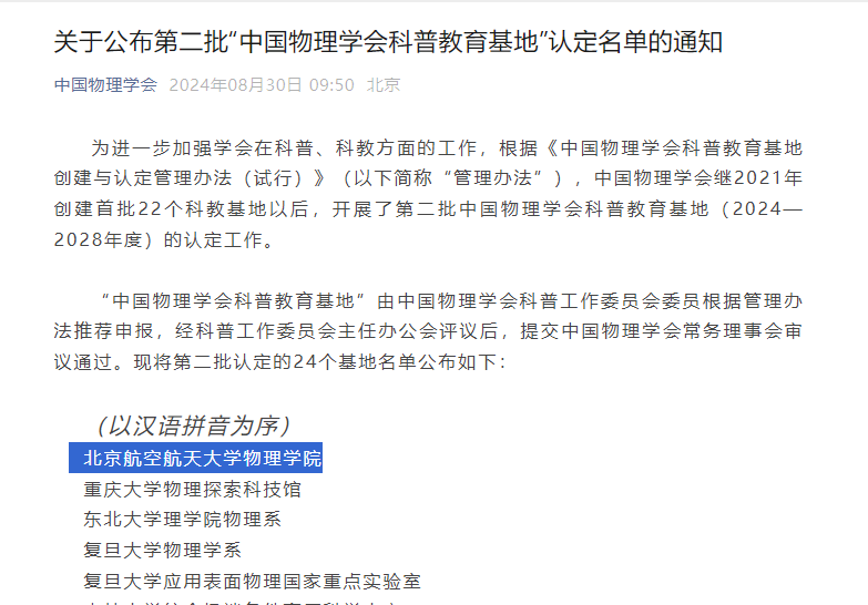 近日,中国物理学会公布了第二批“中国物理学会科普教育基地”名单,yl9193永利集团获得认定。