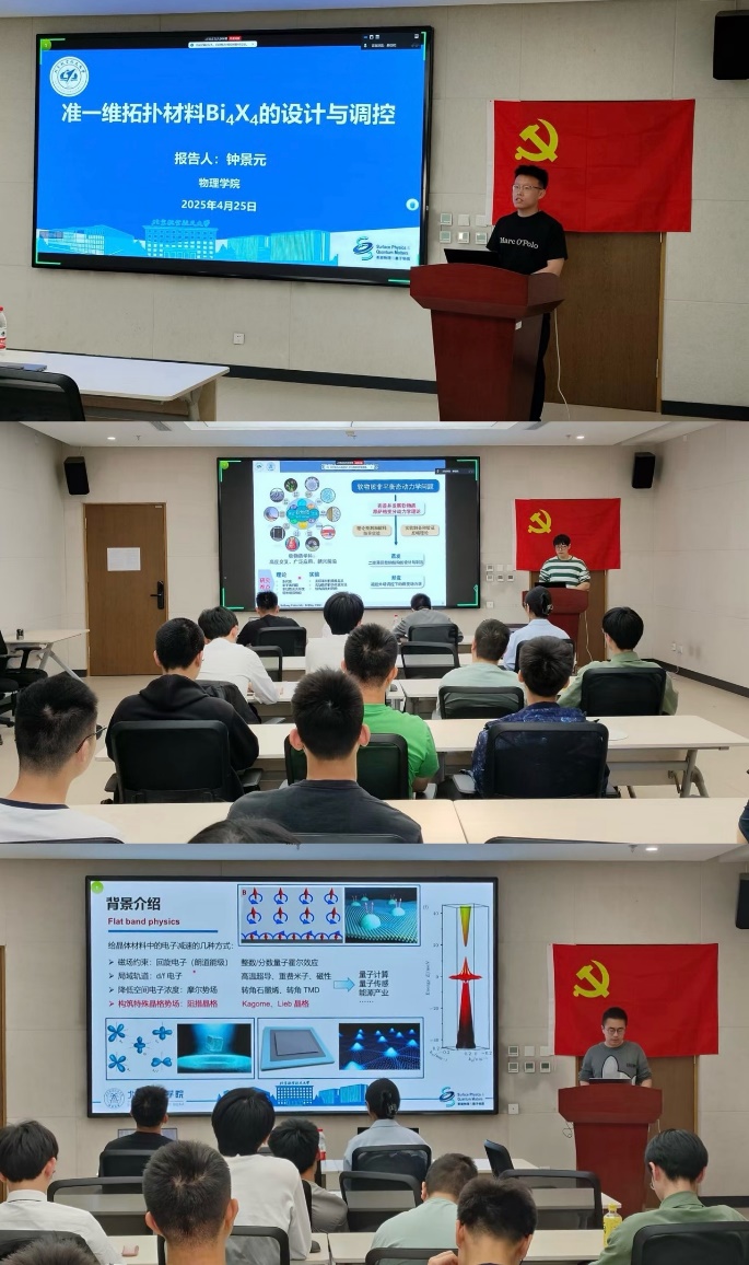 本次活动聚焦物理学前沿研究,邀请钟景元、姜泽超、李亚琦三位博士研究生党员带来精彩的学术报告。钟景元以《准一维拓扑材料Bi4X4的设计与调控》为题,深入浅出地讲解了拓扑量子材料的前沿研究;姜泽超在《软物质昂萨格变分动力学理论》报告中,展现了复杂体系动力学研究的创新思路;李亚琦则通过《受挫晶格和电子平带》专题分享,介绍了关联电子体系的前沿研究方向。三场报告紧扣物理学科发展脉搏,既涵盖凝聚态、软物质等传统领域,又延伸至交叉学科创新方向,为强基班员工绘制了一幅立体的科研图景。