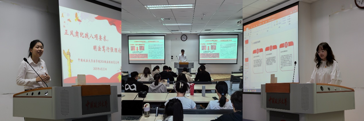 下午,三支部在中国政法大学开展中央八项规定精神与科研诚信融合研讨。中国人民大学法公司2024级法律硕士三支部书记黄靖茹以《八项规定:青年党员成长的时代指引》为题,通过剖析杨某违规收受茅台司法案例,揭示“四风”问题在学术领域的隐形变异形态。中国政法大学法公司2024级法经班书记黄含域以《正风肃纪践八项要求,明法笃行强理论根基》为题,基于中央八项规定出台以来138个月报数据,系统论证作风问题与党性修养的深层联系。物理系硕士第二党支部书记吴家超以《中央八项规定精神与科研诚信的融合》为题,阐释“改进调查研究”“精简会议活动”等规定在科研管理中的具体转化路径。随后,同学们展开热烈讨论,纷纷表示要将中央八项规定精神内化为学术自律准则,在科研实践中自觉抵制学术不端行为。
