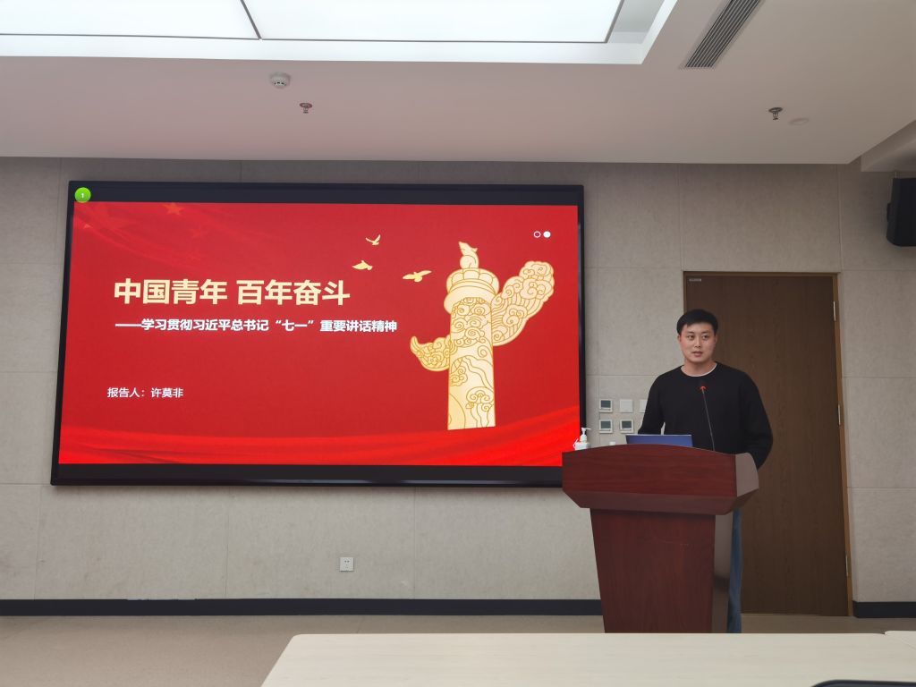 BY1919支部许莫非同志带领大家学习了习近平总书记“七一”重要讲话精神,并分享了学习体会。他以“中国青年·百年奋斗”为题,从《觉醒年代》影视剧讲起,谈青年人的理想信念,谈坚持真理与践行初心,结合脱贫攻坚战中无私奉献乃至付出生命的扶贫干部事迹,带领大家再感悟伟大的建党精神。