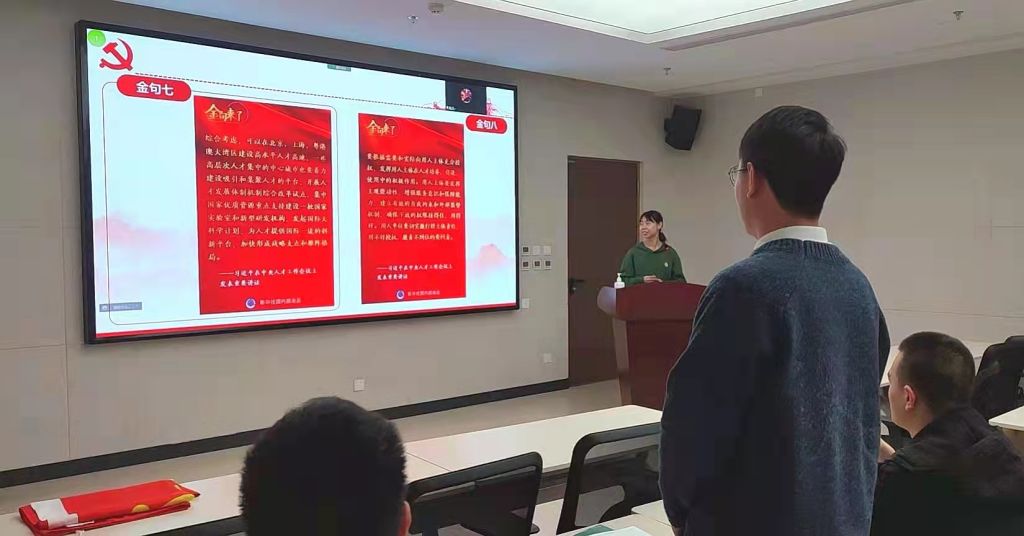 BY1919支部宣传委员李涵同志带领大家学习了习近平总书记在中央人才工作会议上的重要讲话精神。今年是中国共产党成立100周年。在百年奋斗历程中,我们党始终重视培养人才、团结人才、引领人才、成就人才,团结和支持各方面人才为党和人民事业建功立业。从提出“政治路线确定之后,干部就是决定的因素”,到倡导“尊重知识、尊重人才”,再到强调“人才是第一资源”,百年大党求贤若渴、珍视人才的优良传统薪火相传,一代又一代优秀人才接续投身党和人民的伟大事业,在革命、建设、改革的壮阔历史进程中写下动人精彩的篇章。两支部党员同志依次朗读会议“金句”,品读讲话精神,领悟人才队伍建设的重要意义。