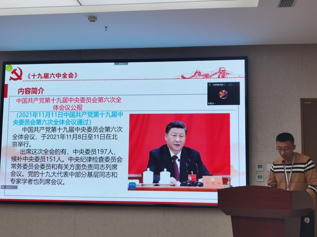 BY1919支部书记徐航同志带领支部同志学习中国共产党第十九届中央委员会第六次全体会议公报。该会议于2021年11月8日至11日在北京举行。徐航同志详细讲解了会议的背景及意义。本次全会充分肯定了党的十九届五中全会以来中央政治局的工作,回顾了新民主主义革命时期、社会主义建设时期、改革开放和社会主义现代化建设新时期中党面临的主要任务,号召全党、全军、全国各族人民要更加紧密地团结在以习近平同志为核心的党中央周围,全面贯彻习近平新时代中国特色社会主义思想,大力弘扬伟大建党精神,勿忘昨天的苦难辉煌,无愧今天的使命担当,不负明天的伟大梦想,以史为鉴、开创未来,埋头苦干、勇毅前行,为实现第二个百年奋斗目标、实现中华民族伟大复兴的中国梦而不懈奋斗。