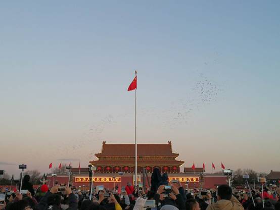 活动由党支部书记全华锋组织开展,顶着凌冽严寒,怀着满腔热情,大家在凌晨3点,搭乘出租车从公司出发,在天安门广场排队4个多小时,终于迎来了新年里中国大地的第一缕阳光,充满温暖与希望。此时,中国人民解放军国旗护卫队迈着铿锵步伐,庄严肃穆地托举着崭新地五星红旗走到汉白玉升旗台,在国歌与第一缕日出光辉地伴奏下,五星红旗迎风飘扬,经过2分07秒缓慢地升至32米高地旗杆顶端。升旗过程中,数万观众激动深情地凝望着上升的红旗,自豪地唱着国歌,兴奋不已。升旗结束后,大家欢呼雀跃,在歌唱祖国的嘹亮歌声中拍照留念。