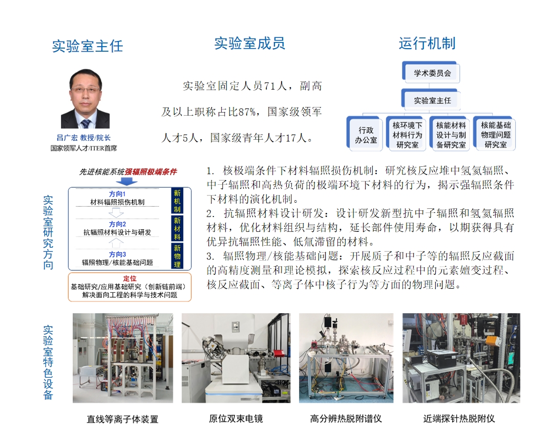实验室聚焦于核能材料及相关物理问题研究,研究方向覆盖核能基础物理、极端条件下的材料与部件行为、核能新材料与部件开发与设计等,已初步形成了集“核能基础理论研究- 核能材料行为研究- 新型核能材料设计与开发”一体化的高水平研究团队,在国际国内核能材料及物理领域占有重要地位。